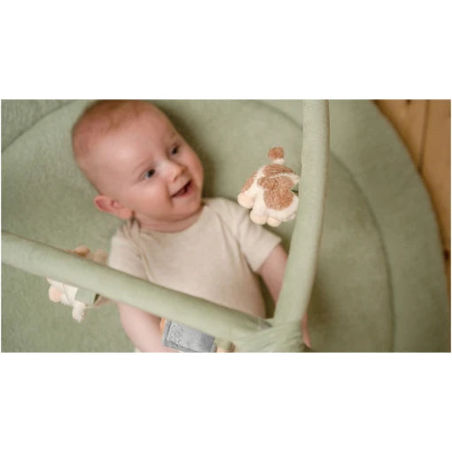 So much to see, feel, and hear. Every day is a new adventure with this playmat from the Little Farm collection. The green mat has two large corduroy arches with 5 different cuddly toys hanging from them. The chicken, cow, sheep, flower, and barn help little ones develop sensory skills and stimulate hand-eye coordination. WARNING! Attach this toy out of the reach of the child. To prevent possible injury by entanglement, remove this toy when the child starts trying to get up on its hands and knees in a crawling position. Adult assembly required. Keep this information for reference.