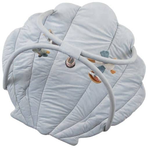 Encourage exploration. Your little one will be challenged to move, reach and grasp with this captivating activity play mat. The super-soft mat has the shape of a shell and channels a harbour-inspired aesthetic with 5 different hanging soft toys that will keep your baby engaged. There is a seagull, a pelican, a lighthouse, a sailboat and a fishy duo.
