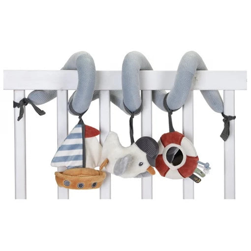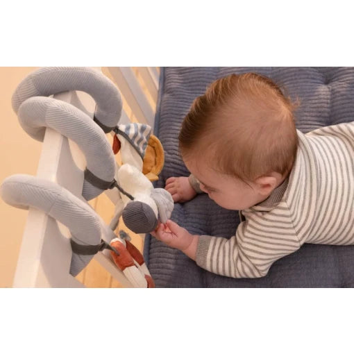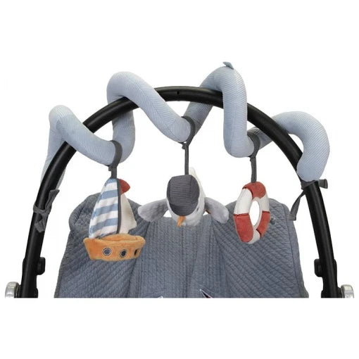 Ahoy there, sailor! Make every day a bayside adventure for little ones with this inviting activity spiral. It stimulates your baby’s first hand-eye coordination and makes for hours of entertainment. Crafted from cotton and corduroy, this touch-and-feel sensory toy includes a hanging seagull, a sailboat and a life ring with various fun labels and a mirror for self-discovery. It’s easy to attach to everything from playpen to car seat and stroller.
