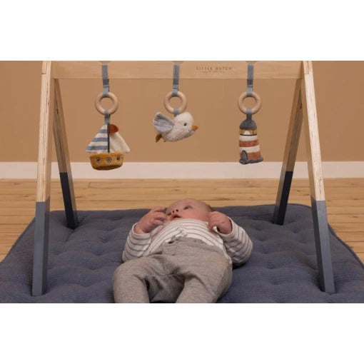 Lift those little arms! Curious babies are guaranteed to have a goodtime with this natural wooden baby gym. It features three different bay-themed activity toys that will do all the entertaining, including a cheery seagull, a little sailboat and a colourful lighthouse. Made for hours of enjoyment, it develops hand-eye coordination, enhances motor skills and stimulates the senses every time they grasp for one of the hangings.
