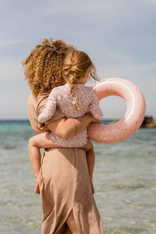 Are you ready to get active in the water? This long-sleeved swimsuit of recycled polyester will keep you warm in the water and protects you from the sun while you play all day long. Whether you love to surf the water or float around in a swim ring, this one-piece suit is the perfect choice for summer activities at the seashore. With the warm summer look of the Summer Flowers design, this long-sleeved swimsuit with ruffles at the bottom is not just pretty, it’s comfortable and practical too with the zipper on the back. It is made from UV protective fabric and is available in sizes 62/68, 74/80, 86/92 and 98/104. Pair with a beach poncho and a swim ring and you have all the essentials you need for the beach. Don’t forget to always use sunscreen lotions to protect your little one.