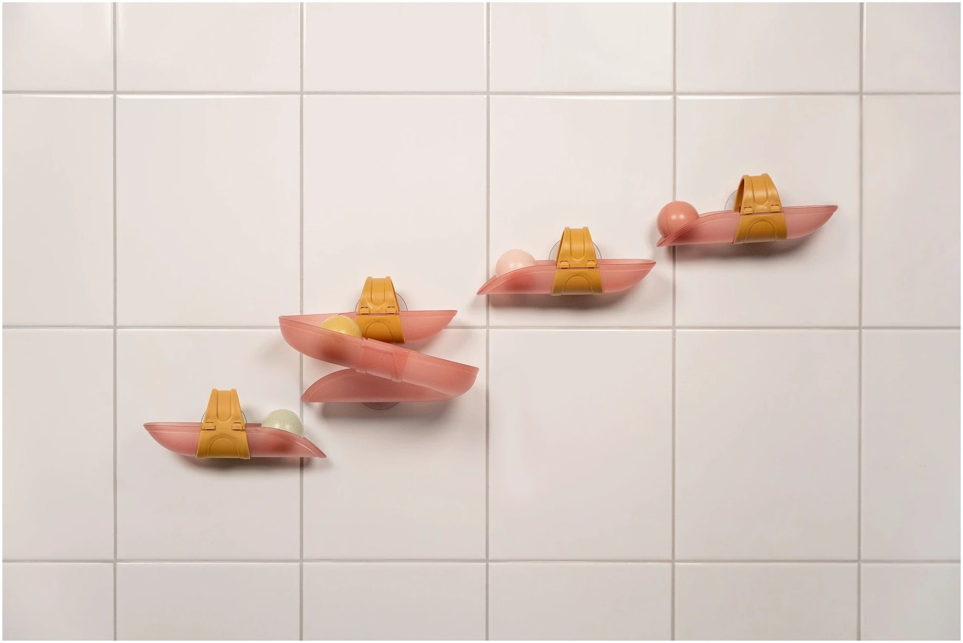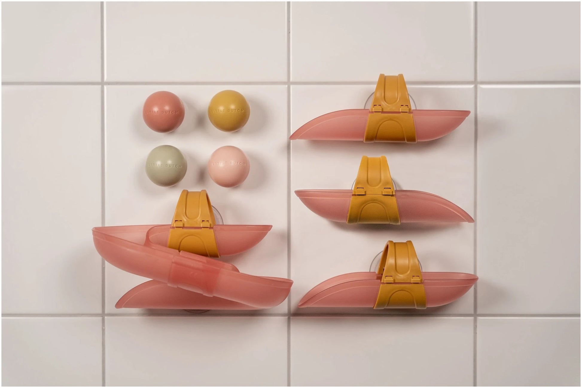 Here comes the ball and … SPLASH! Make bath time a rolling adventure! Set up the tracks on the bathroom wall and let the ball roll down for splashes of fun in the bathtub. This bathtub ball track set will turn the bathtub into your little one’s favourite play aera. The 3 pink tracks have a suction cups that are easily attached to and removed from the bathroom wall. Thanks to the curved and straight shapes there are endless courses to be created. Great entertainment that also helps fine motor skills and problem solving.