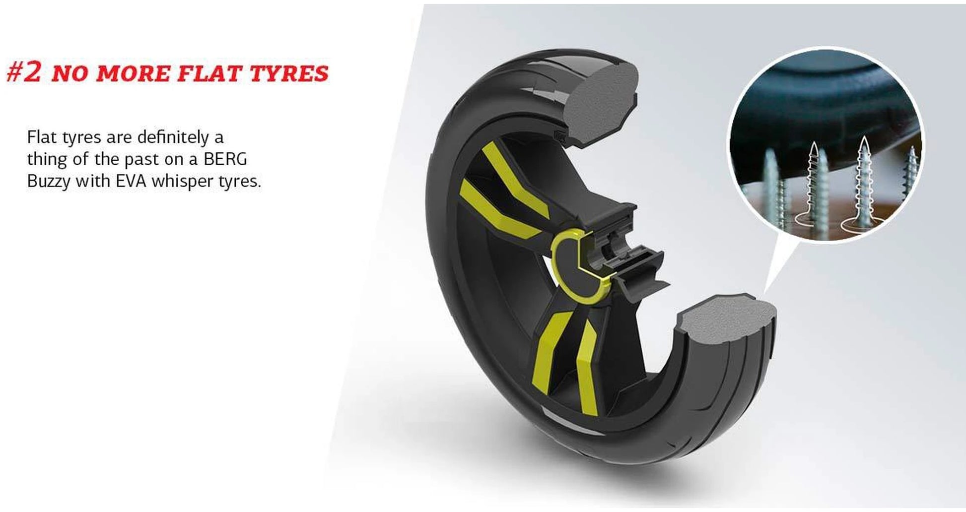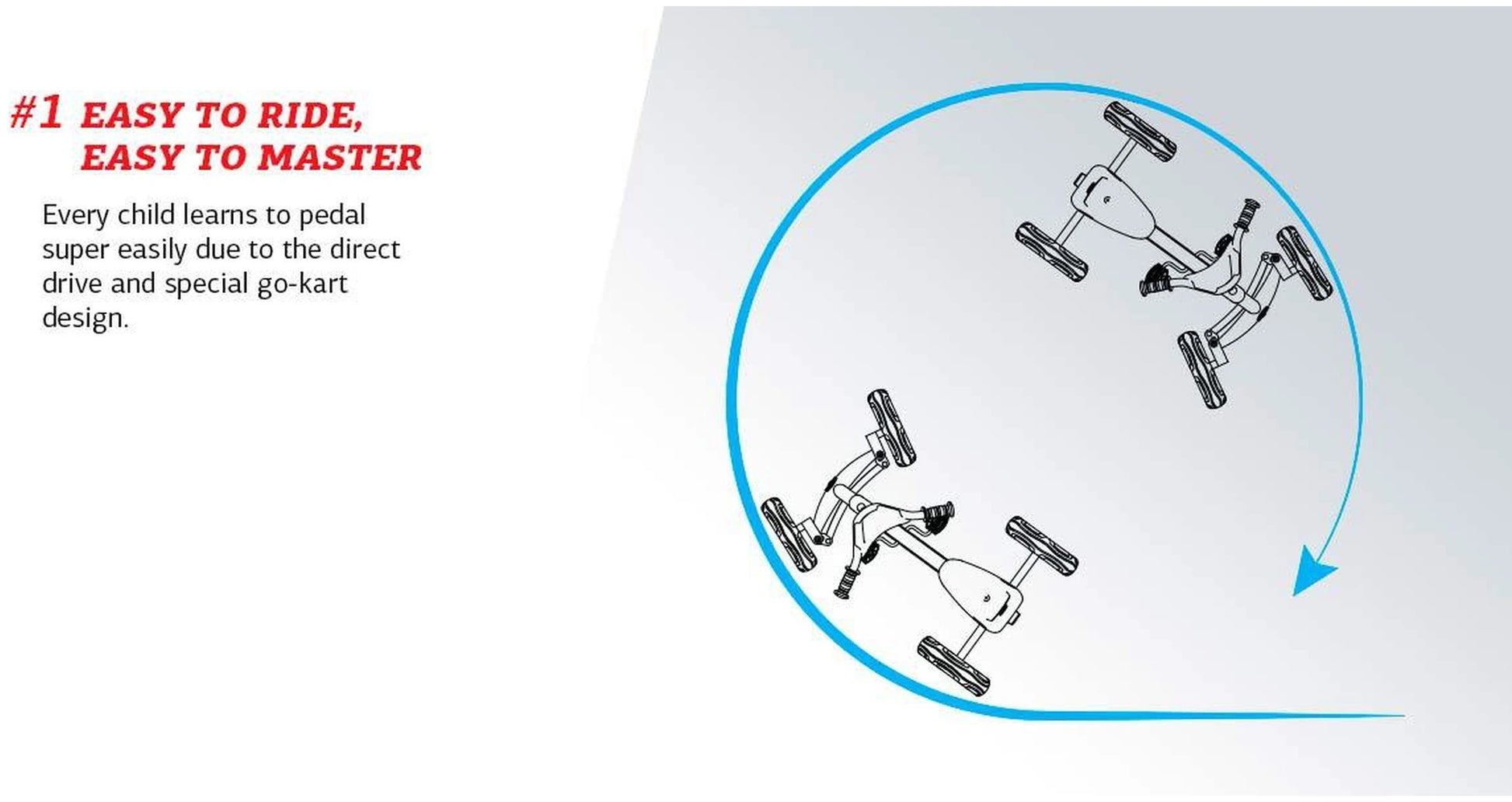 The robust stable design has 4 wheels to keep the go-kart firmly grounded, all-terrain quiet whisper tyres that will not puncture, and sturdy suspension springs to give a smoother ride.