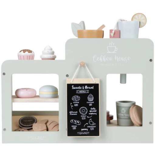 Coffee or tea? Would you like a cookie or cake to go? With this lovely wooden toy set you instantly have a place to play house or play shop. Become a true barista and make your mum and dad a nice cup of cappuccino with your own coffee maker. Or serve tables in your own little coffee shop with a menu filled with delicious treats.