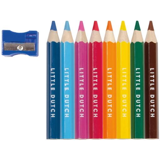For little hands and big ideas. These vivid colour pencils allow kids to let their imagination run free. The set includes 8 captivating hues and comes with a matching pencil sharpener. Thanks to the chunky shape and thickness, they are easy to grip and control for artists of all ages. Our colour pencils are a great way for kids to let their creativity go as far as they take it. They can also improve coordination and responsiveness. Plus, they give little artists feedback. Kids learn to press hard for more colour and light for less coverage. This set is designed for 3 years and up.