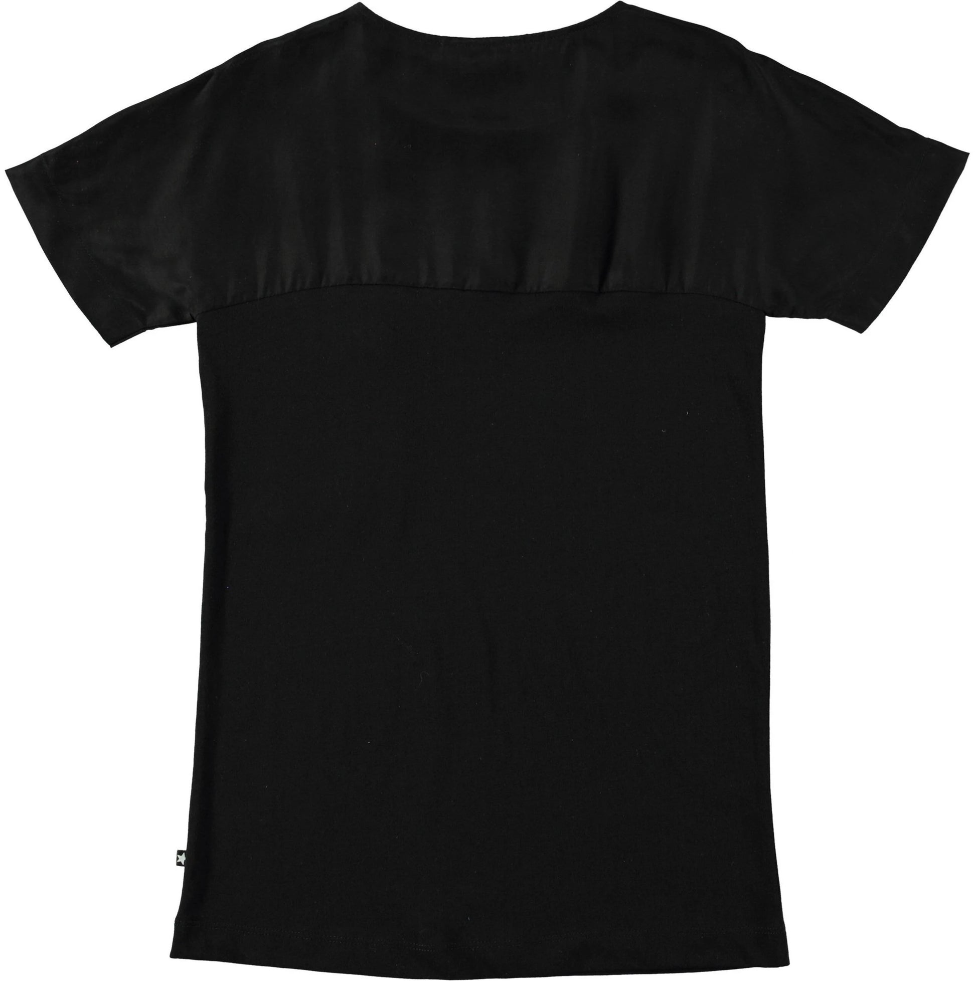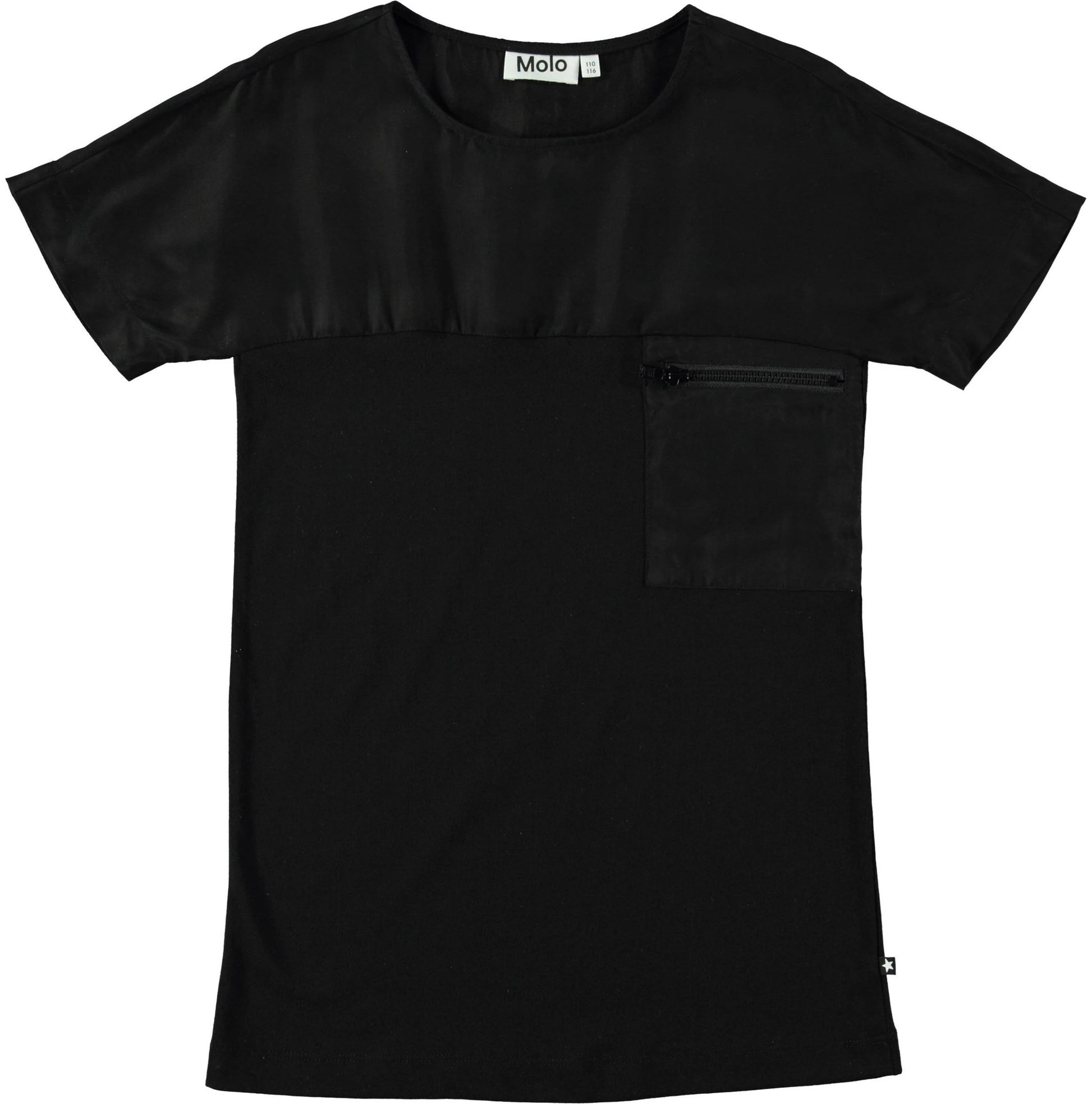 Simple black dress in a cupro/jersey blend and with a single zipper pocket at the chest.