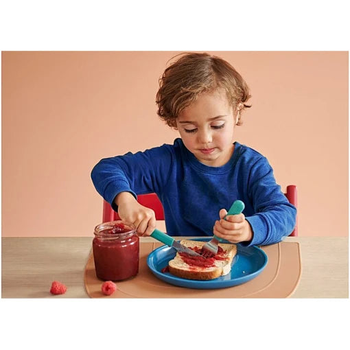 - Cut, stir, poke and bite! This 3 pcs Mepal Mio cutlery set makes a great start for when your toddler is ready to self-feed. Thanks to the light blue colour and Sailors Bay illustrations, everyone at the table knows who’s cutlery this is. The comfortable grips fit little hands perfectly and the fork and blade are designed to be safe for children from 12 months and older. Self-feeding is a big step in the development of your child. Picking up a spoon or fork develops hand-eye coordination, fine motor skills, and confidence too. So go ahead and taste those lovely flavours all on your own.
