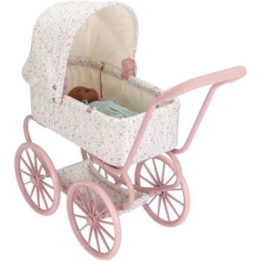 Take delightful walks with this sturdy metal doll stroller and give your doll the ride of her life! Thanks to the four large wheels, this stroller rides smoothly and stably, perfect for indoors and outdoors. Underneath, you’ll find a handy storage basket, so your doll accessories are always within reach. The pink frame and soft handles make this stylish stroller complete.