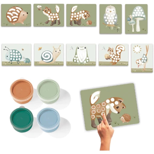 Let your little one playfully discover nature with the finger paint set from the Forest Friends series. Designed especially for little hands, this colourful set invites your little one to let their creativity run wild. With four soft shades and cute pre-printed cards with forest animals, your child can get straight to work creating the most beautiful works of art. The paint is safe and easily washable, ideal for hours of crafting fun. As your little one fills the cards with the colourful paint, it encourages the development of fine motor skills, eye-hand coordination and creativity. Let their imagination blossom as they playfully bring the wonders of the forest to life. Suitable for children aged 3 and up.
