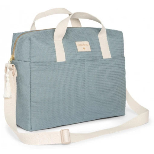 The Gala bag in organic cotton honeycomb has the ideal size and can be attached to the pram. It is the perfect bag for your daily family outings, its waterproof interior and its two inner pockets will allow you to store all your baby’s amenities. With two outside pockets, perfect to store what you need to have right on your fingertips. Thanks to its braided handles in cotton, you can hang it on your pram or carry it on your shoulder.