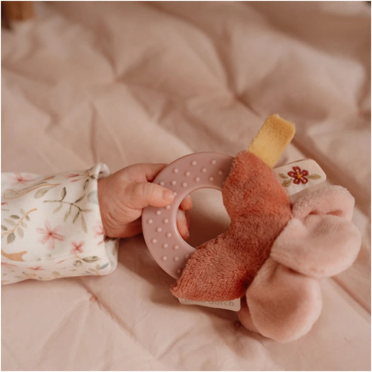Our favorites from the Fairy Garden collection together form a perfect maternity gift or baby shower gift. This beautiful box contains three soft products to sleep with, hug and play. The cuddle cloth with soft bird is wonderful to cuddle with, but is also nice for a game of peekaboo. The hug deer is always ready for a sturdy hug and adventures full of play and fantasy. This set also contains a teeth for softening when teeth come through. And the nice flower on the ring stimulates the hand-eye coordination and the curiosity of children. The three products are packed together in one beautiful gift box.