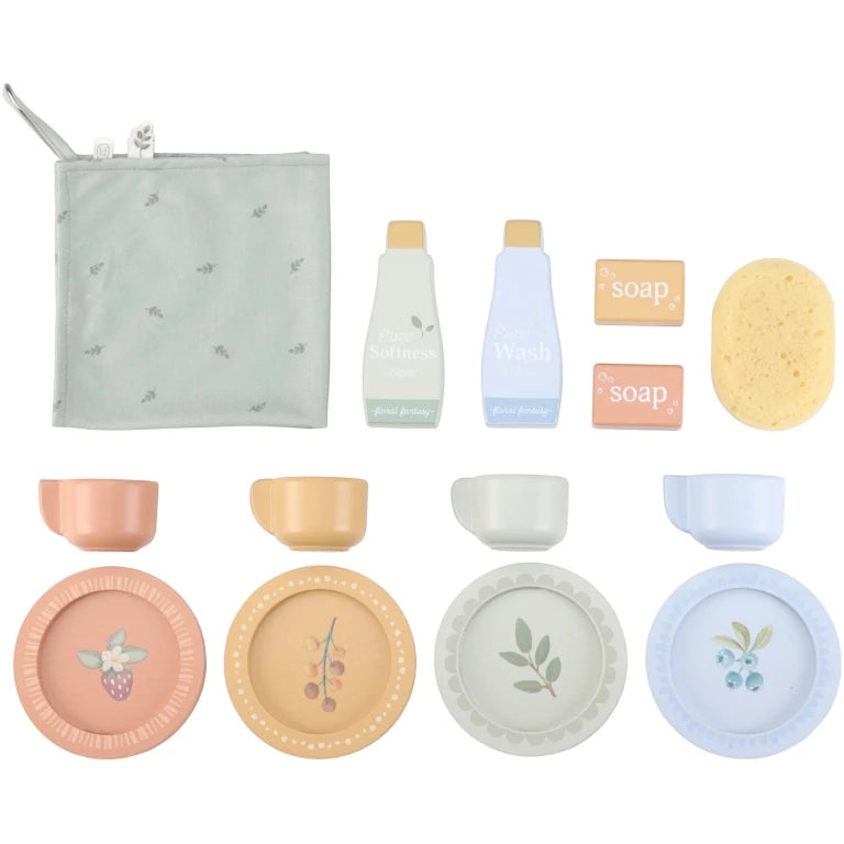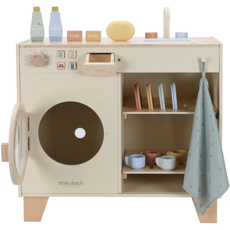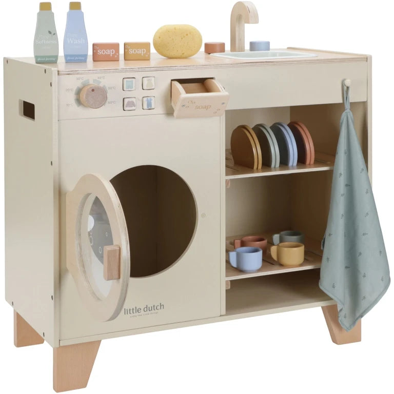 Perfect for little helpers, it includes four cups, four saucers, two plates, detergent, a bar of soap and a soft dish towel. Kids can wash dishes in the sink and freshen up their dolls’ clothes in the washing machine.