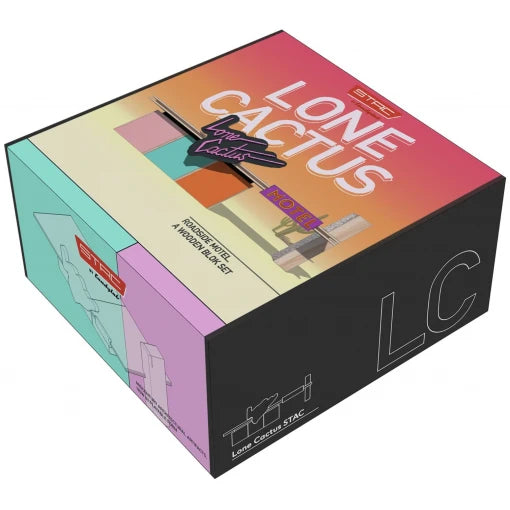 The first artifact of our “Carchitecture” line called STAC is a set of brightly painted wooden blocks and thoughtfully picked design cues. It all comes together to form a quintessential mid-century roadside motel, the imaginary Lone Cactus. Its scale works with our line of car. A step-by-step manual is also included to help with set up. *Does not include cars or Lone Cactus Totem. No glue or tools required. Assembly time is measured in seconds.