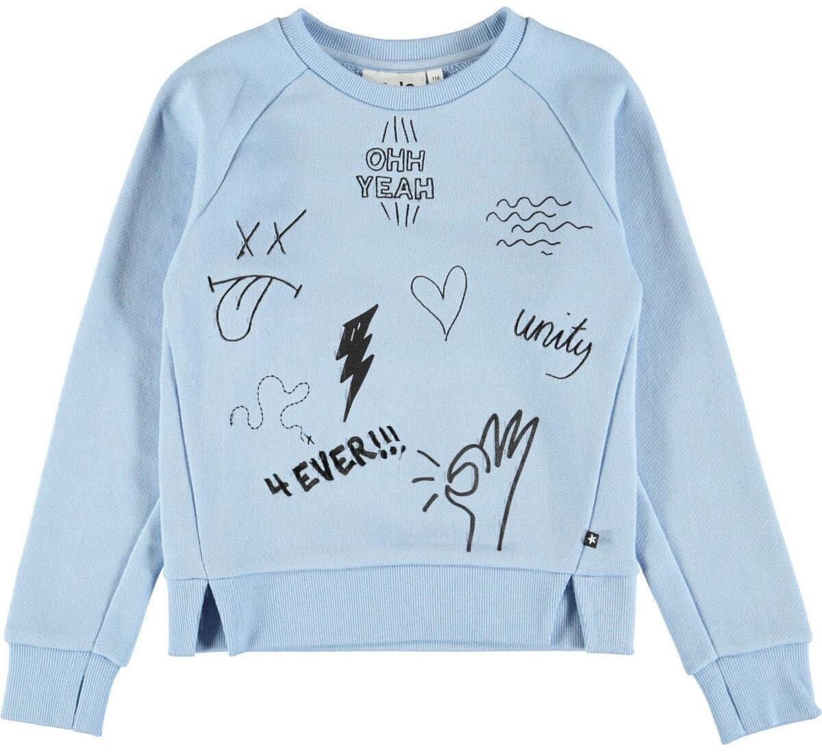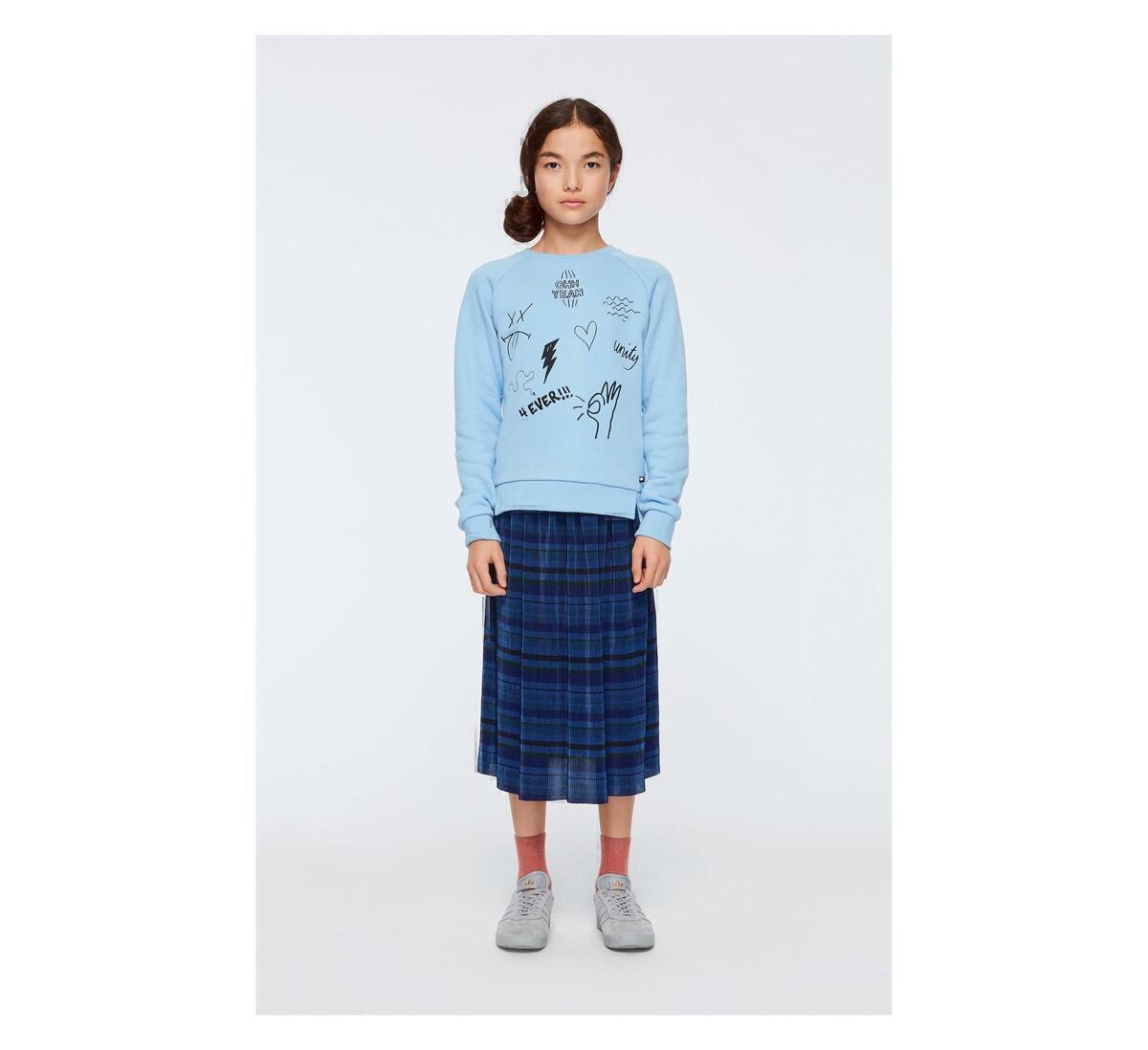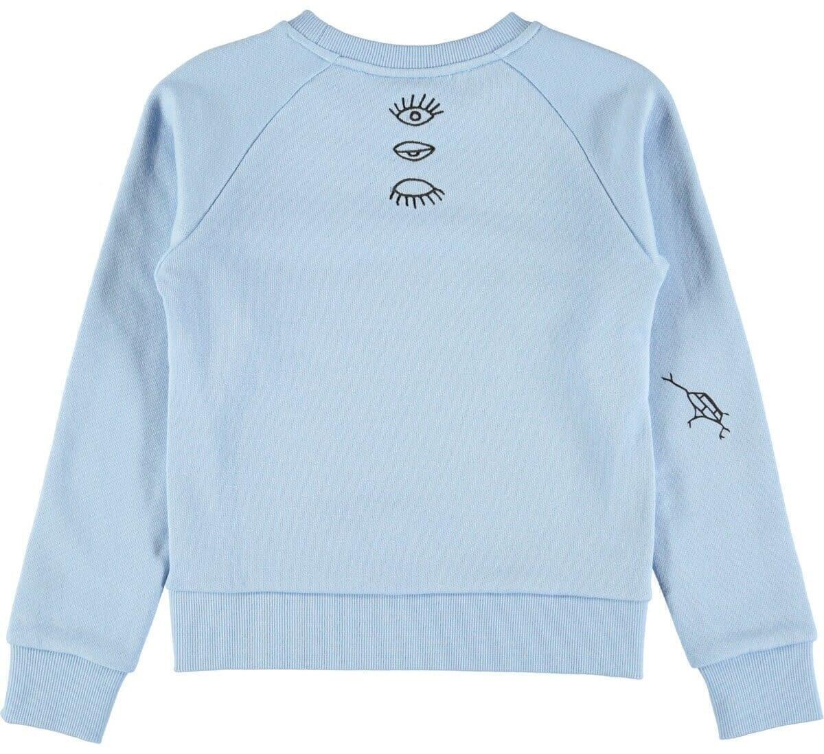 Light blue sweatshirt with embroidery on the front, neck and sleeves. It has a dart at the bottom and rib at the neck, sleeves and bottom.