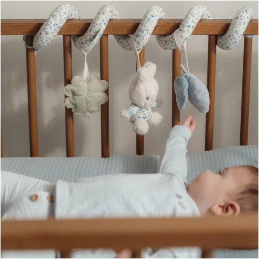 Look, feel and discover! This fun and entertaining activity spiral will occupy babies both at home and on the road. Simply attach this practical toy with the strings at the ends. It strengthens the senses and stimulates the hand-eye coordination. The activity spiral is made of Corduroy with cotton. Miffy is attached to the spiral, along with a clover four and a leaf.