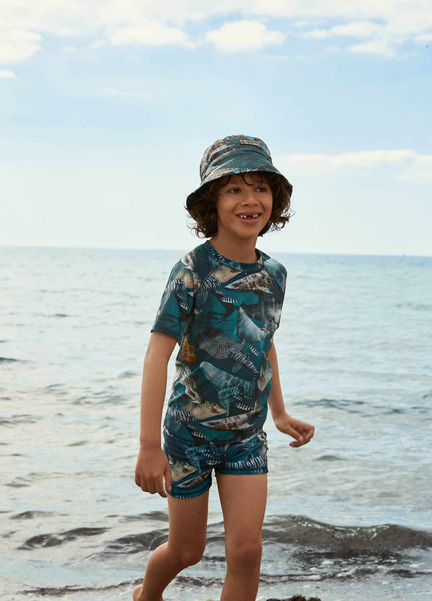 Neptune is a wonderful UV rash guard that protects against the sun’s harmful rays. This Neptune has a fun motif of sharks in different animal prints. The top is thin and comfortable to wear because it is easy to move around in. Mix and match the top with a pair of swim trunks for a cool surfer look. Molo’s swimwear has a UV protection of 50+. This Molo product is recycled and made from REPREVE reusable polyester. REPREVE is the leading, most trusted brand in reusable fibres and is made from used plastic bottles and other waste. The production of recycle