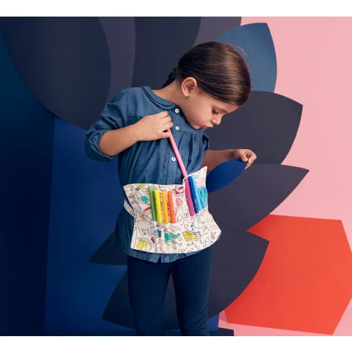 Cotton marker transfer belt, which, in addition to being very practical, can even be painted with markers for fabric, washed, and then be like new again! Now with the OMY case belt you can have your markers everywhere! The belt is made of cotton, while it has velcro for easy and quick adjustment around the child’s waist. The belt can also simply be rolled up to have all the markers in one hand! For best results, opt for OMY special fabric markers. Designed in France and manufactured in Italy. Dimensions 30 x 19 cm.