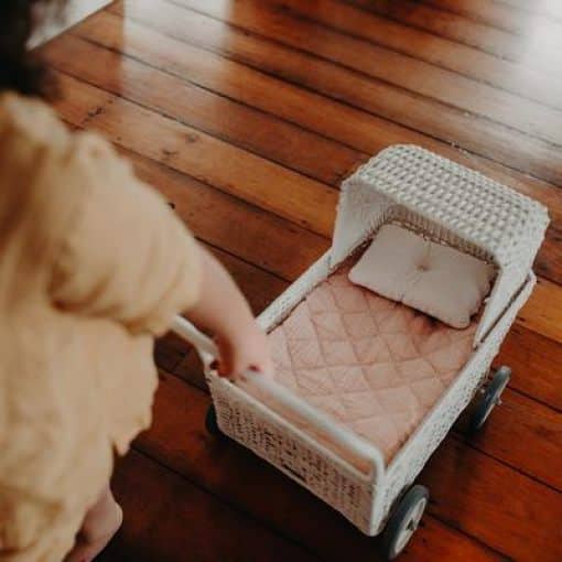 Strolley is a revolutionary design in imaginative play. This hand-woven rattan basket on wheels switches from a pram to a shopping trolley, by just lowering the hood of the pram.