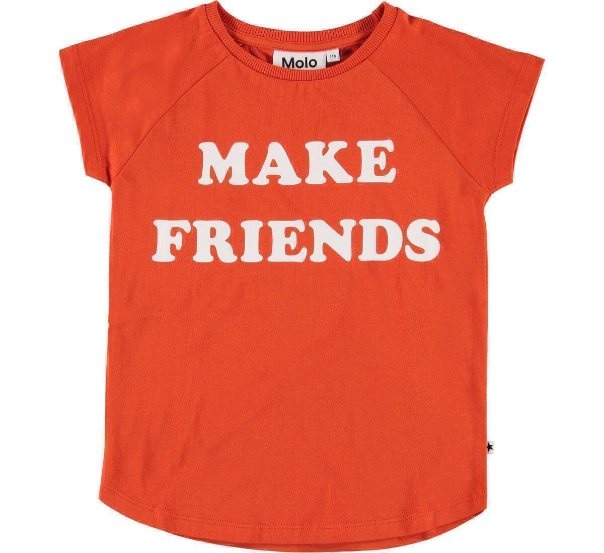 Make Friends’ with this red t-shirt that has a printed text on the front. This Molo product is GOTS certified which means that it is made with certified organic fibres and produced under strict social and environmental criteria throughout the entire manufacturing process. In addition, the GOTS certification secures that the product is free of hazardous chemicals