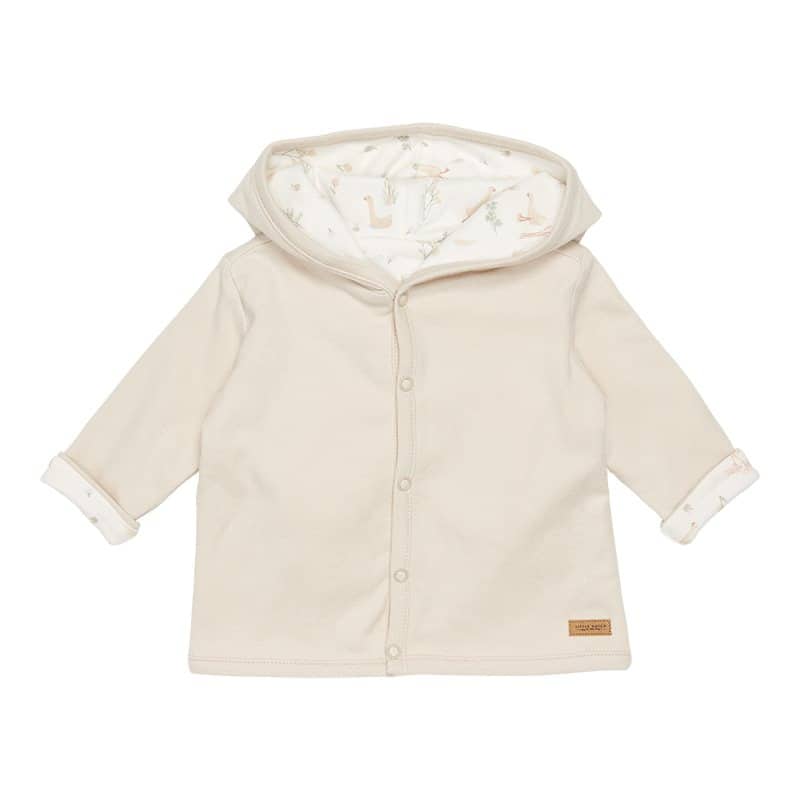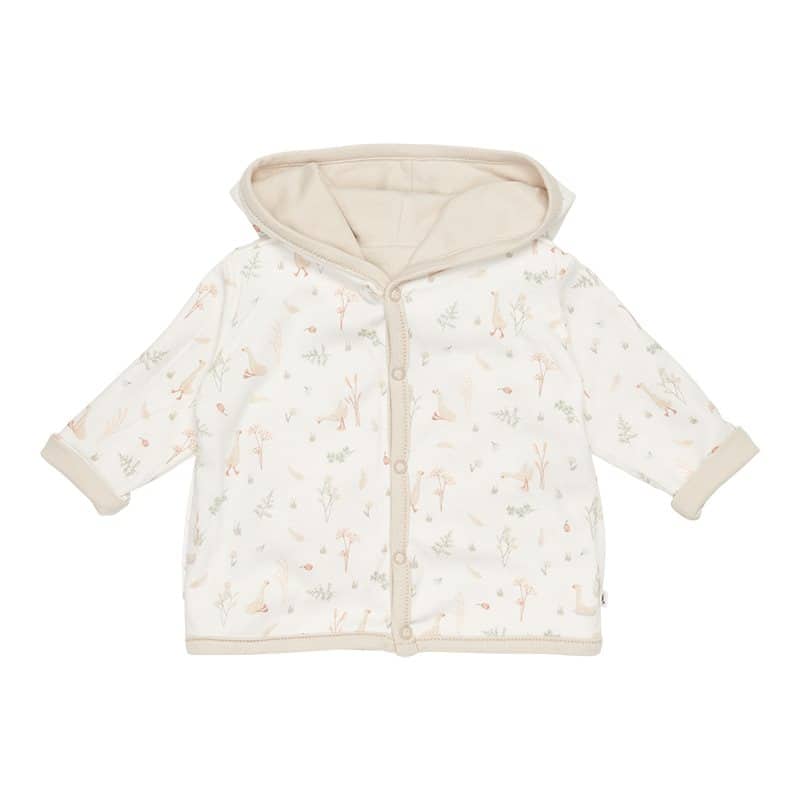 Keep your baby warm in this reversible jacket made from certified organic cotton. This comfy style can be worn two ways. One side is rendered in an sand hue, while the other side feature our signature ‘Little Goose’ print. The jacket has a hood and a front opening that easily fastens with five buttons.