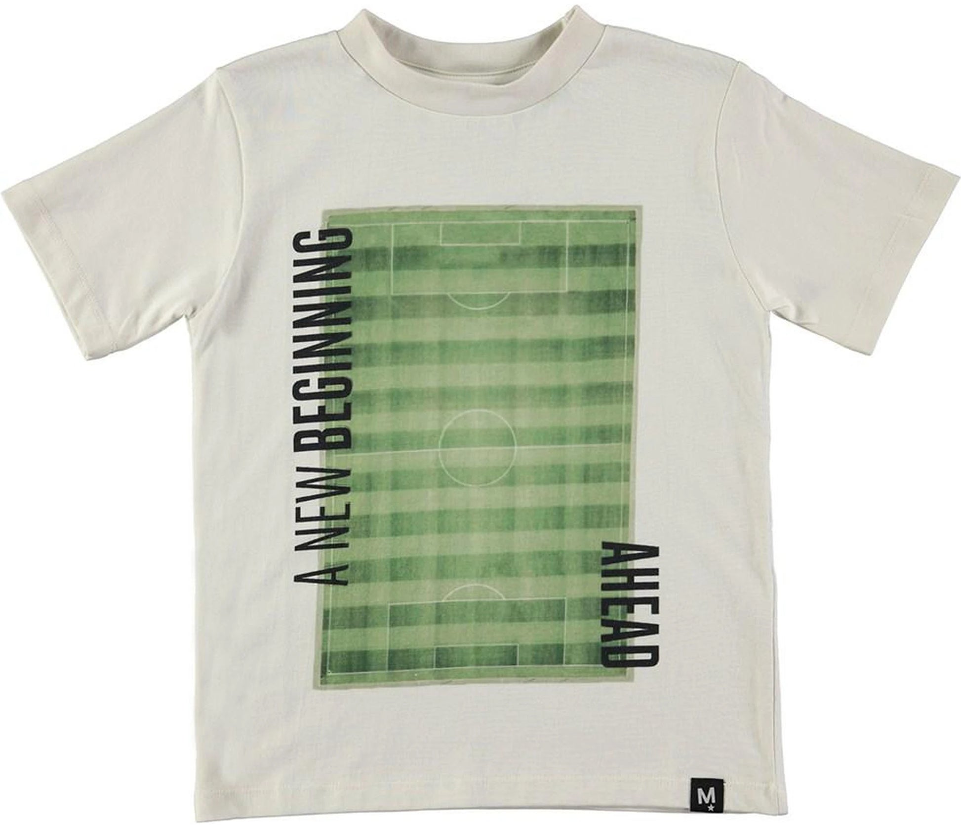 Short sleeve, white cotton t-shirt with a green football print and a graphic text down the sides. This product is Oeko-Tex certified.