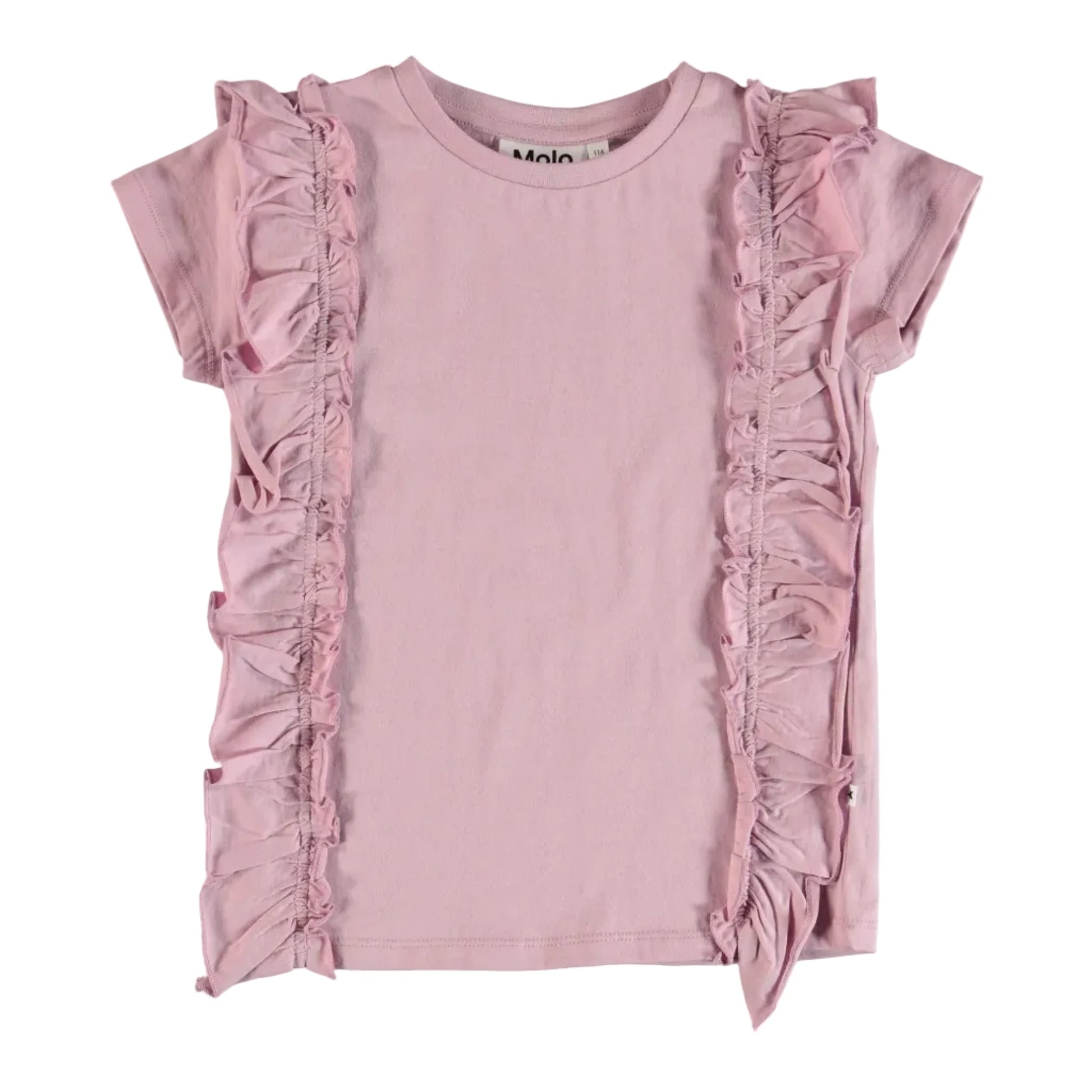 Rosel is a rose coloured t-shirt with a rosette-inspired ruffle edge down the sides for a feminine touch. This product is Oeko-Tex certified.