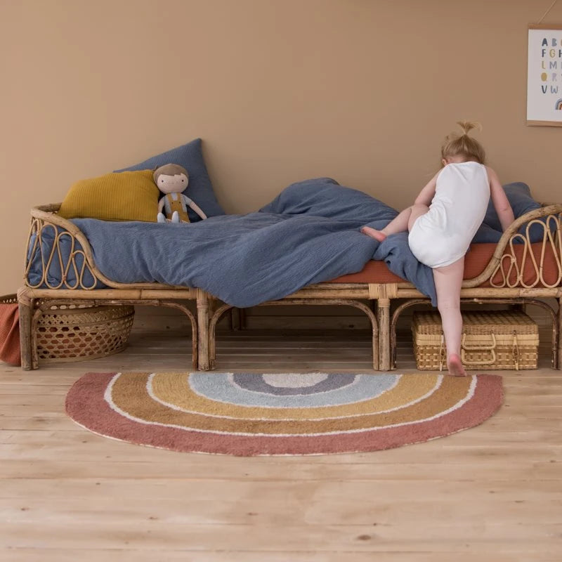 Add a touch of style to the nursery or children’s room with this beautiful hand-made rainbow rug! This rug, shaped as a rainbow, is a semi-circle of 80 by 130 cm in size.