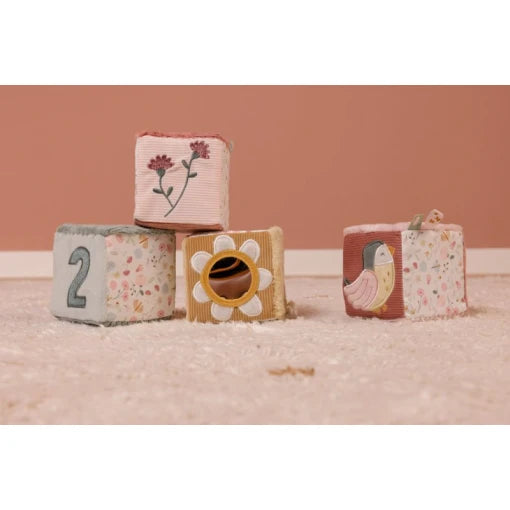 Ring, rattle, and roll! With varied sounds, textures, and features to explore, this fun set of soft activity blocks will keep your little one entertained. Plus, it stimulates hand-eye coordination. The cheery set consists of 4 multi-sensory blocks, each one defined by soft colours and decorated with a unique number. Baby hands will also discover our captivating labels, plush panels, and a sunny mirror. Pair with other toys from our Flowers & Butterflies collection for a coordinated playroom.
