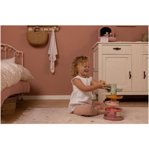 Let’s get the ball rolling! This captivating Spiral Tower makes for endless excitement. The colourful toy consists of 5 soft-hued pieces that your little one can easily stack. Drop the balls one by one onto the top tier and see how each of them winds and rolls down. The Spiral Tower enhances hand-eye coordination and teaches a child the concept of cause and effect, ensuring it’s both fun and educational. The Spiral Tower comes with three big easy-to-grip balls in different colours that make a little sound when moving.