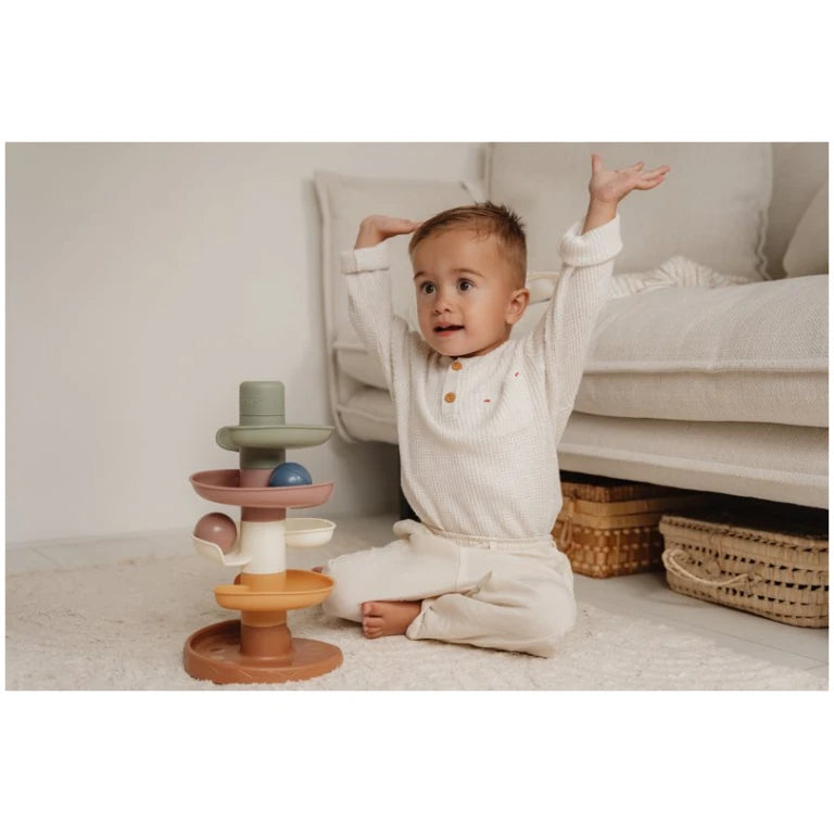 Let’s get the ball rolling! This captivating Spiral Tower makes for endless excitement. The colourful toy consists of 5 vintage-hued pieces that your little one can easily stack. Drop the balls one by one onto the top tier and see how each of them winds and rolls down. The Spiral Tower enhances hand-eye coordination and teaches a child the concept of cause and effect, ensuring it’s both fun and educational. The Spiral Tower comes with three big easy-to-grip balls in different colours that make a little sound when moving.