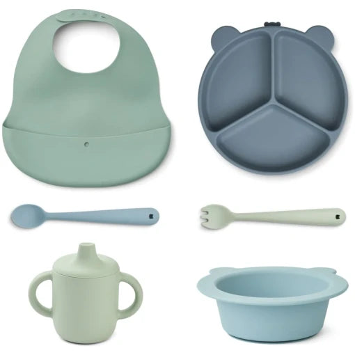 - Set includes: Neil cup, Peony suction bowl, Siv feeding spoon, Scott fork, Stacy divider suction plate and Ember bib.