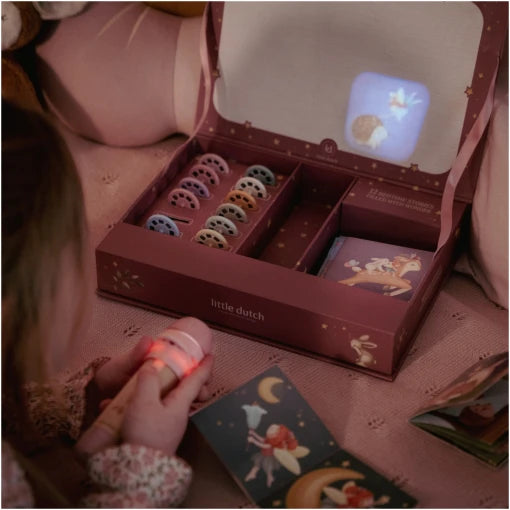 The Projector flashlight has a sturdy wooden handle and works on batteries, so that it can go anywhere. After the story you can easily store the flashlight and all accessories in the beautiful storage box. Perfect for children who like to discover and experience stories.