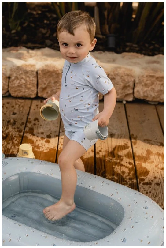 Swim, splash and play about all day! With this comfortable swim short of recycled polyester there’s nothing holding you back to having fun in the pool or at the beach. Go on adventure and look for the many treasures between the sand and in the water. This light blue Sailors Bay themed swim short is sprinkled with seagulls, lighthouses and sailboats on a blue background. The elastic waistband and cord tie gives this short a comfortable fit, whether your little one is swimming or playing. The swim short is made from recycled polyester and is available in sizes 62/68, 74/80, 86/92 and 98/104. Pair with a towel and your favourite summer item and you have all you need for hours of water fun. To complete the Sailors Bay look combine the swim shorts with a matching rash guard. Don’t forget to always use sunscreen lotions to protect your little one.