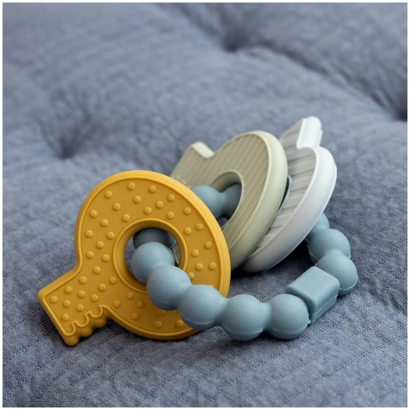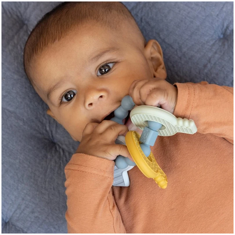 The appearance of the first teeth is a milestone but not always comfortable for your baby. To soften the pain we have created this multifunctional teething toy in the shape of a keychain. It is multifunctional: it’s a fun toy and it will provide soothing comfort and helps stimulate the eruption of your baby’s new teeth. The keychain has different textures which makes it challenging for you baby to chew on. It’s specially designed for little fingers to grasp!