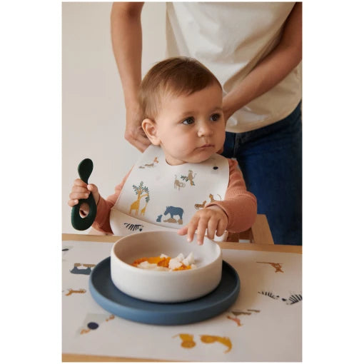 - Complete silicone mealtime set with playful prints