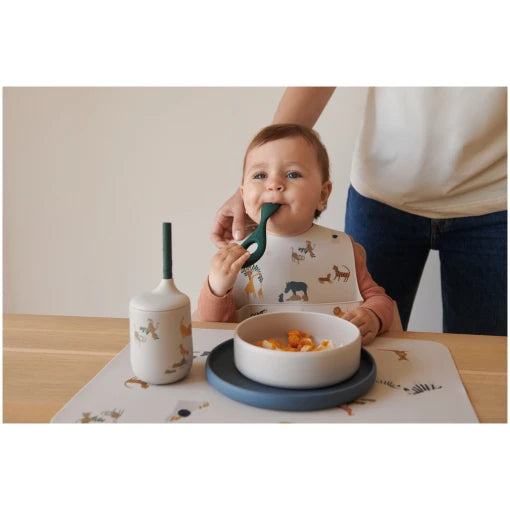- Set includes: Set includes Ellis cup w. Straw, Brandon plate, Damina bowl, Liva spoon, Tilda bib and Jude placemat.