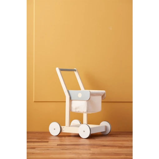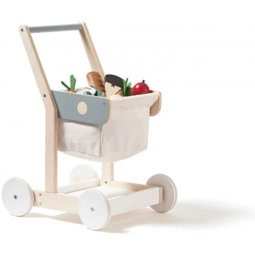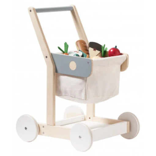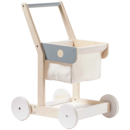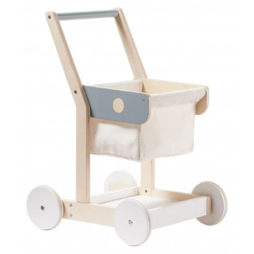 A wooden shopping trolley with 100% cotton storage. clean with a damp cloth. The cotton basket can be hand washed