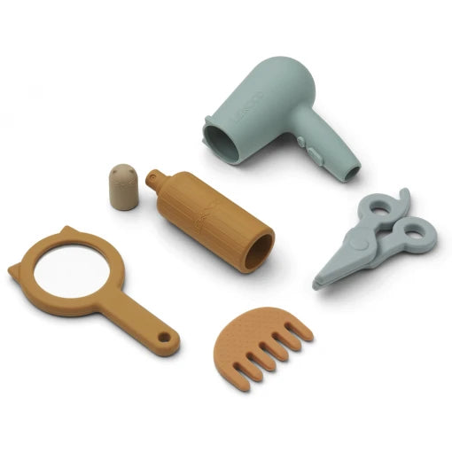 Dimensions: Hair spray: D 3,5 cm H 11 cm Hair dryer: H 10,5 cm W 5 cm L 9cm Mirror: H 13 cm W 7 cm Comb: H 4,5 cm W 6,5 cm D 1 cm Scissors: W 6 cm L 11,5 cm D 2 cm