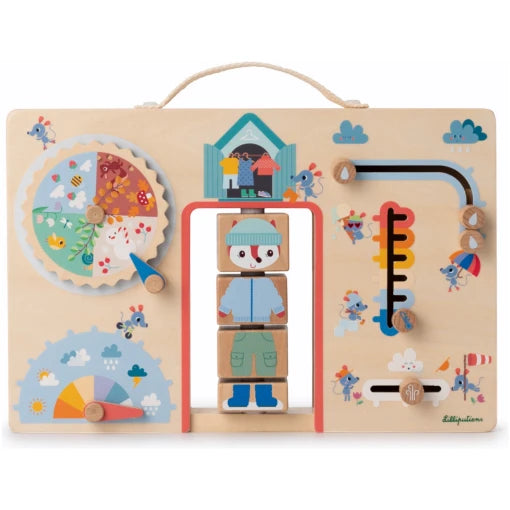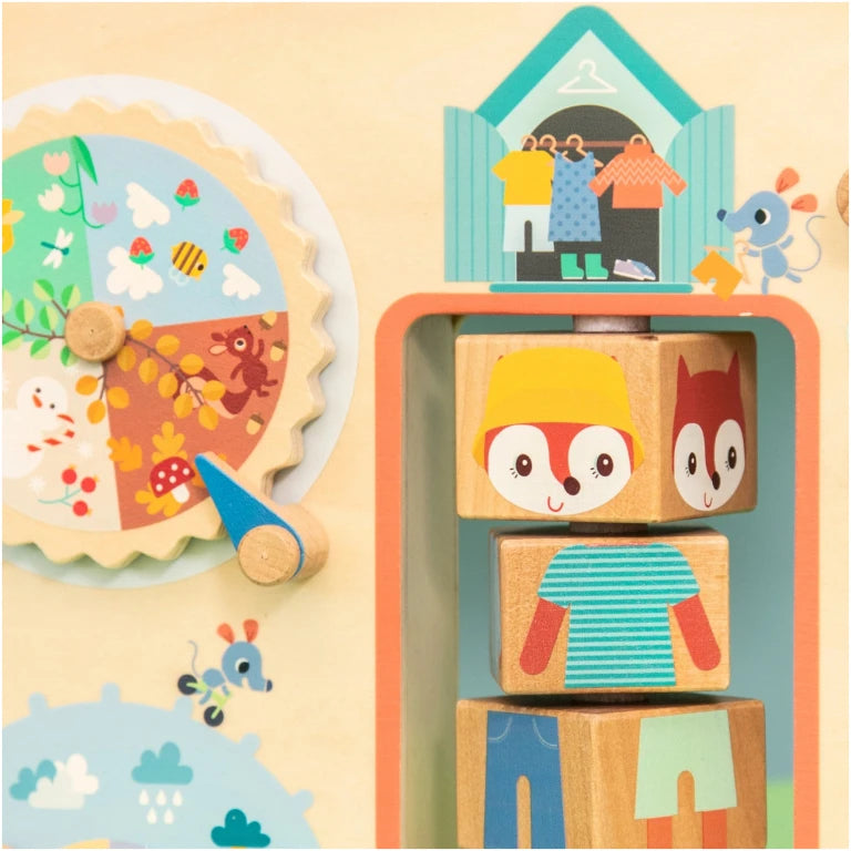 With Alice the little fox, consisting of 4 wooden blocks, which your child can turn to dress her according to the weather conditions of the day.