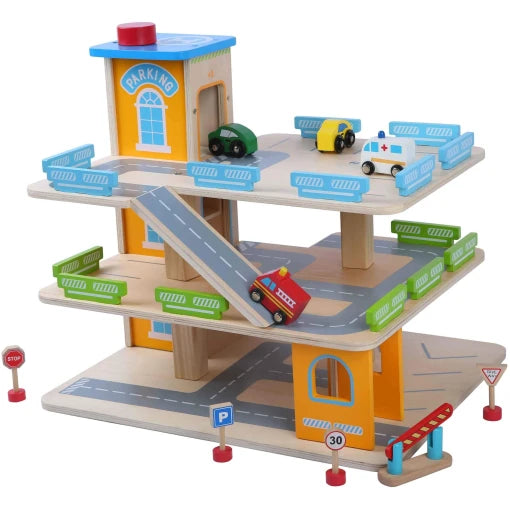 Wooden parking toy that will provide many hours of carefree play for children while developing their creativity. It includes 4 wooden cars, street signs, and has 3 floors and an elevator! Suitable for ages 3 and up. Dimensions 43.5 x 40 cm.