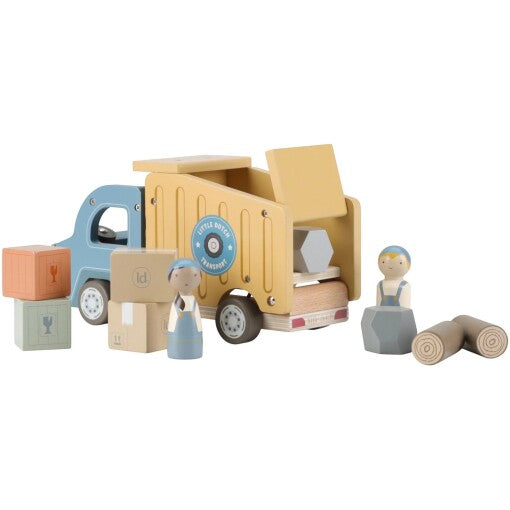 - Includes dump truck, 2 wooden figures and 8 wooden accessories.