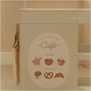 Welcome to the market! With this beautiful wooden market stall, children can play their own shop. The fabric canopy gives an authentic market atmosphere and with the chalkboard and illustrated cards, they can beautifully display the products. The set also includes a shopping bag and crates for a real shopping experience. Turn the market stall around and it becomes a café, complete with a menu and cheerful illustrations. Combine with the cash register, scale, or tiered stand with pastries for even more play fun. What’s on the menu today?