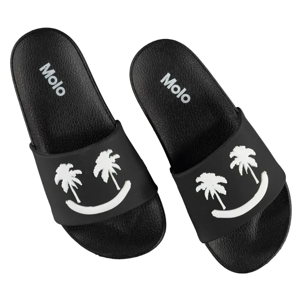 Molo’s Zhappy sandals are a must in the summer heat when you need to give your toes some air. These slippers are in black with fun white palm smiley.